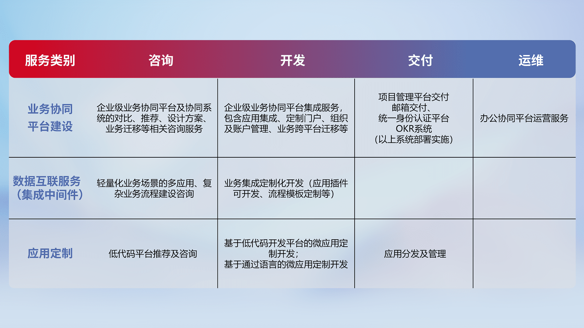 针对钉钉、、、、企微、、、、IDaas等平台级产品提供产品的规划、、方案、、、交付、、定制化开发等服务,,,,实现如统一协同办公、、、智能客户服务、、、混合会议管理、、智能数据查询、、等业务场景,,,,实现数字化转型。。
